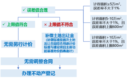 建设项目按经规划和自然资源部门批准的规划设计图纸施工,不改变规划批准的使用功能、不涉及容积率调整、不涉及违法建设,通过规划条件核实后,规划条件核实计容面积虽超出建设工程规划许可计容面积,但属于施工误差、测量误差等合理范围的,无需调整土地出让合同。