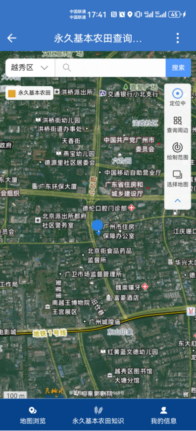 平台操作流程十分简便。用户搜索进入后允许定位,通过定位、周边、绘制范围功能自动锁定目标区域,就可实时查询永久基本农田情况。作为耕地保护数字化升级的重要举措,将永久基本农田以半透明橙色图层的形式在地图上清晰标注。更值得关注的是,平台还支持卫星影像切换对比,公众可直观查看地块影像,同时内置永久基本农田知识模块,明确告知“哪些能做、哪些禁为”。