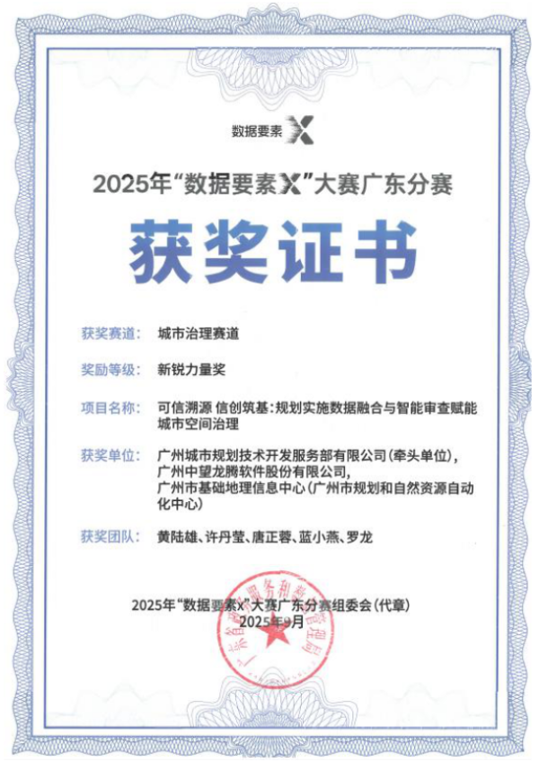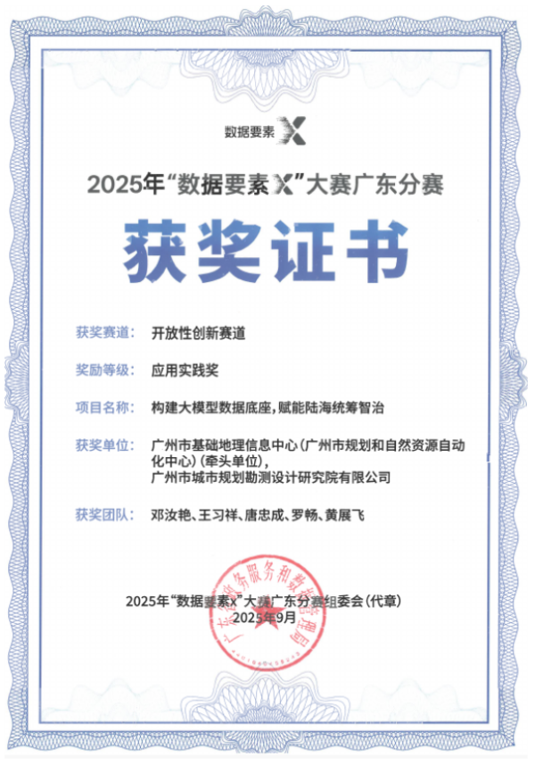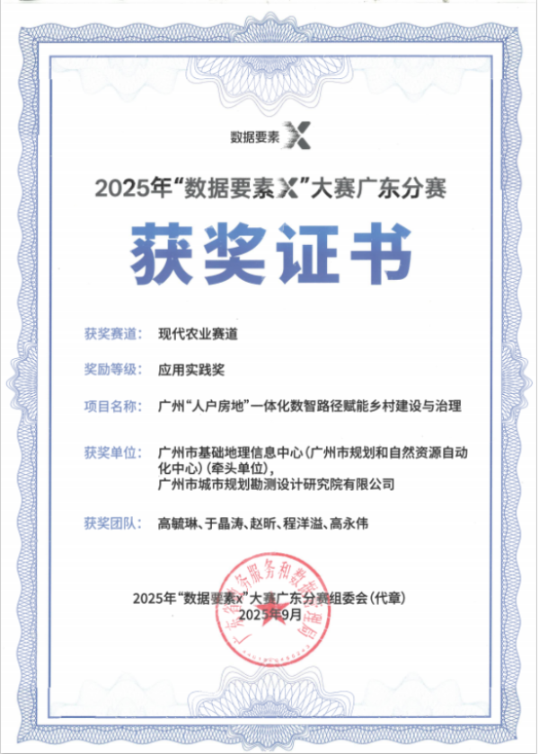 在近日落下帷幕的2025年“数据要素X”大赛广东分赛中,广州市基础地理信息中心精准布局、多点发力,选派5个优质项目分别参与现代农业、开放性创新、城市治理和科技创新四大赛道的角逐。历经4个多月的激烈比拼,5个项目在不同赛道上全面绽放、表现亮眼,全部成功闯入决赛。最终,中心凭借扎实的业务积累与出色的创新实力,从众多参赛项目中脱颖而出,斩获1项二等奖、4项特色奖的优异成绩,实现“参赛项目全部获奖、每条赛道皆有收获”的圆满成果,展现出在多元业务领域的综合竞争力与持续创新活力。