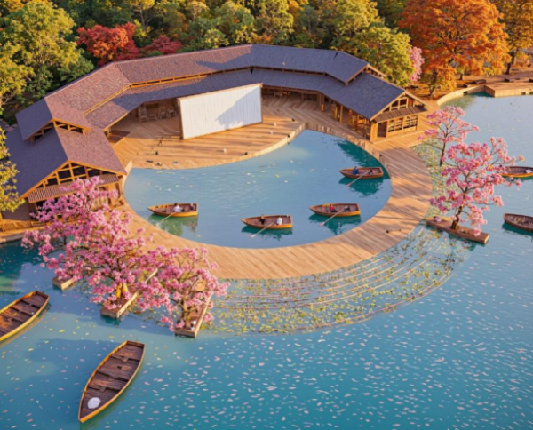 作品《龙江水岸·智慧派潭——派潭世界级生态休闲度假小镇概念方案》以“活力旅居”为引擎,打造石马龙田园旅居综合体,融合生态居住与趣味体验,串联白水寨风景区资源,形成一站式度假动线。同时深度融入客家民俗文化,通过定期举办祈福仪式、传统音乐表演等特色活动,实现自然生态与人文情感的双重连接。