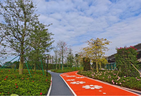以全民运动、全龄友好为理念,融合生态保护与市民需求,公园设置徒步步道、球类运动场地、文化展示区等功能区域,除传统健身器械外,还植入高标准专业运动场地,实现从单纯散步、休闲、游玩到全民运动的功能升级。公园建设健身步道长度约10公里,可作为半程马拉松活动的载体。公园新建3个篮球全场、3个篮球半场、3个羽毛球场、1个足球场、2个滑板场,可承接徒步、篮球、羽毛球、网球、足球、滑板等系列全民体育赛事活动。为满足不同人群需求,规划设计搭配2个驿站、1个淋浴间、3个儿童乐园、2个儿童沙池,为家长、老人和小朋友配套相应设施,让体育健康融入日常的同时促进代际融合与社交互动。公园所有场地均配备夜间照明系统,实现“昼赏花、夜运动”,打造全天候运动“主场”,花都城际公园正逐步成为周边居民最受欢迎的生态休闲运动长廊。
