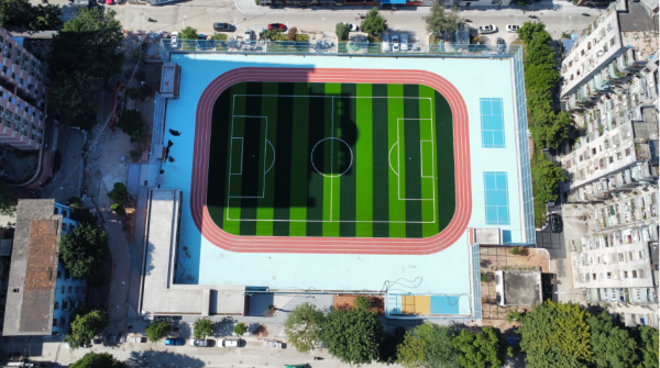 更有创意的是,停车场正上方,曾经老旧的露天场地,如今变身色彩亮丽的专业塑胶足球场,安全舒适、活力十足。