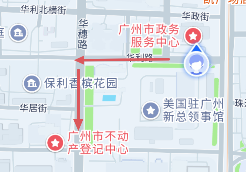 广州市政务服务中心(天河区华利路61号)至广州市不动产登记中心(天河区华就路31号)可按照地图红色箭头路线抵达。