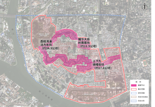 重点范围:为荔湾14个历史文化街区,包括昌华大街、宝源路、恩宁路、上下九-第十甫等。范围北至中山八路,南至珠江后航道,西至黄沙大道,东至人民高架路,总面积约229.7公顷。该片区是广州传统历史文化风貌保存最集中最完整的片区之一,有全国重点文物保护单位粤海关旧址、沙面西桥及中国历史文化名街沙面街。片区以传承、弘扬、活化优秀岭南文化为主线,亟待全面优化产业结构,提升发展水平,带动区域高质量发展。
