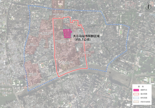 重要节点:为大小马站古书院群所在区域,东至景豪坊东区,南至西湖路,西至教育路,北至中山五路,面积约5.7公顷。该片区是广州著名的书院街,在清代曾有全国最多的书院。