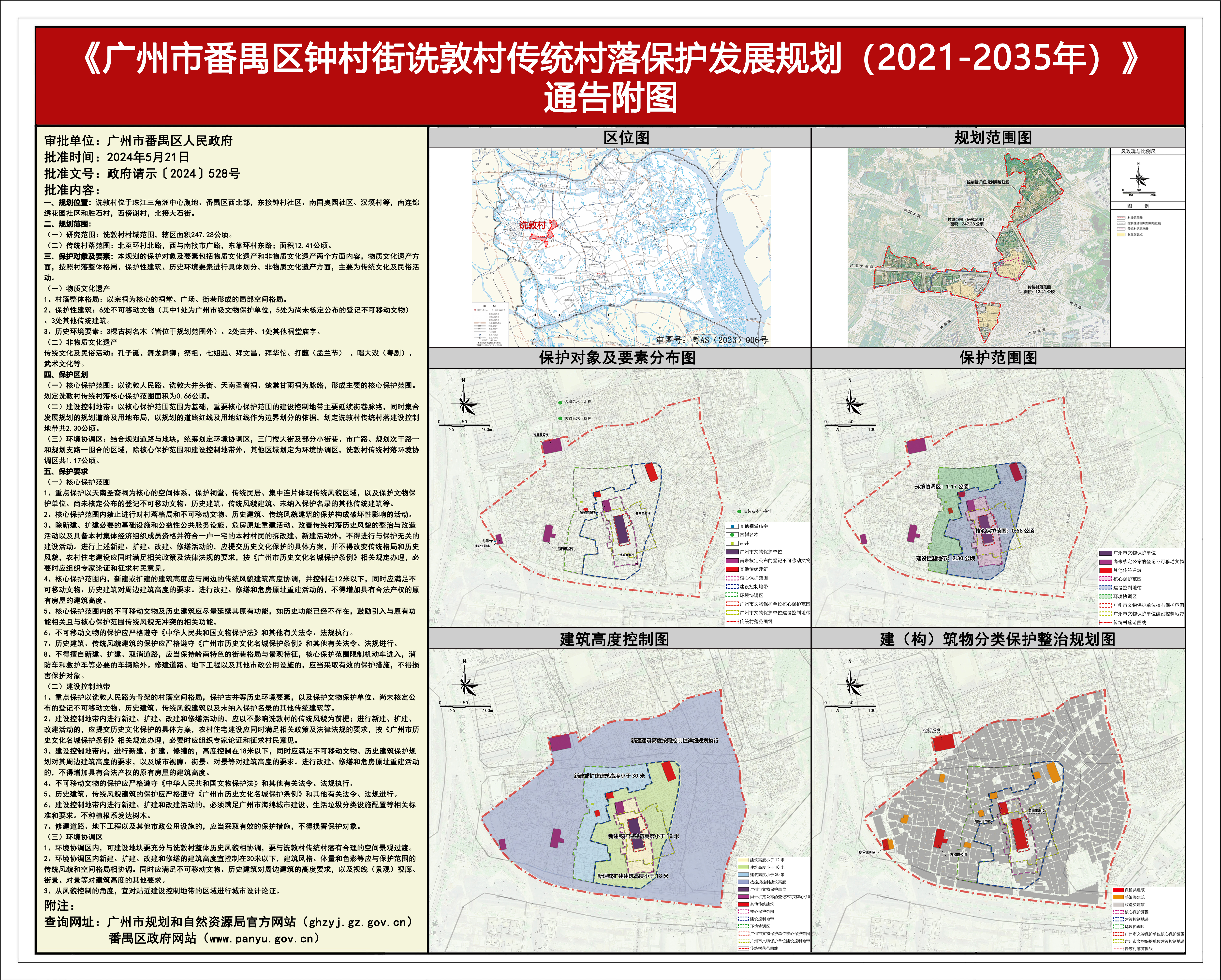 根据《中华人民共和国城乡规划法》、《广州市历史文化名城保护条例》等法律法规要求,《广州市番禺区钟村街诜敦村传统村落保护发展规划(2021-2035年)》已完成征求意见、批前公示等程序,经番禺区人民政府批准实施(政府请示〔2024〕528号)。