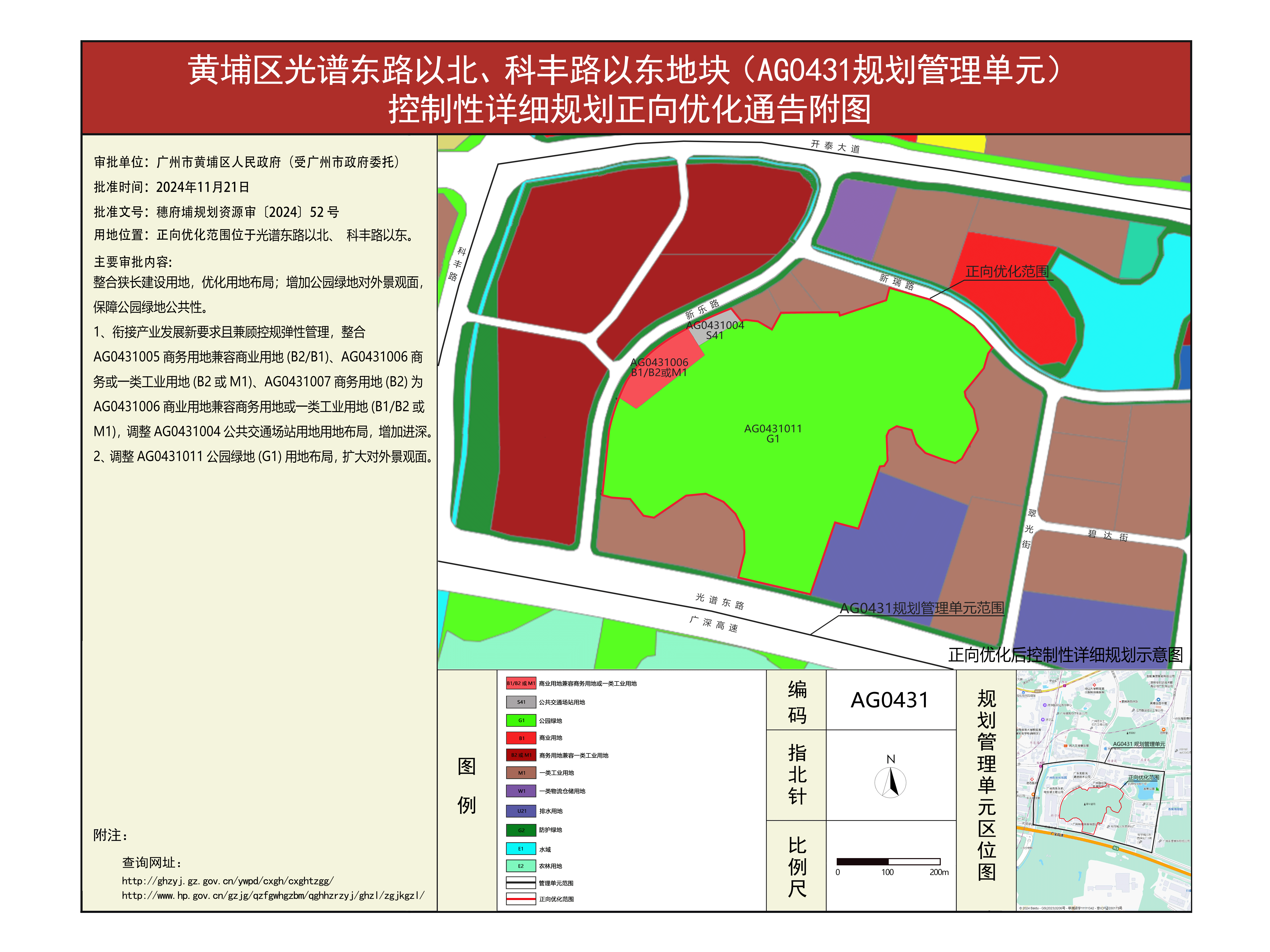 根据《广东省城市控制性详细规划管理条例》要求,《黄埔区光谱东路以北、科丰路以东地块(AG0431规划管理单元)控制性详细规划正向优化方案》已完成规划技术审查、批前公示等程序,并经黄埔区人民政府(受市人民政府委托)批准(穗府埔规划资源审〔2024〕52号),自批准之日(2024年11月21日)起生效。