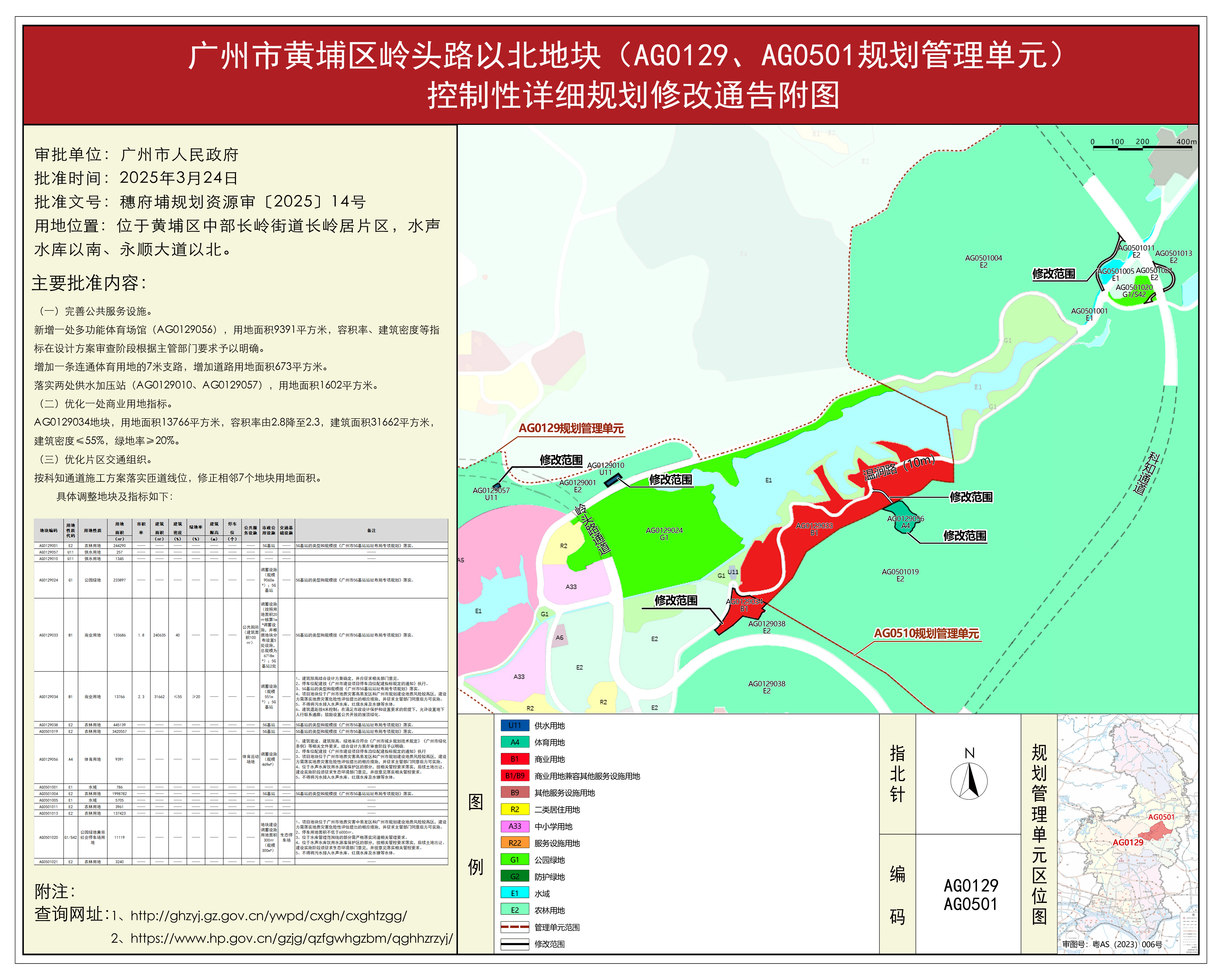 2.广州市人民政府关于同意广州市黄埔区岭头路以北地块(AG0129、AG0501规划管理单元)控制性详细规划修改的批复(穗府埔规划资源审〔2025〕14号)