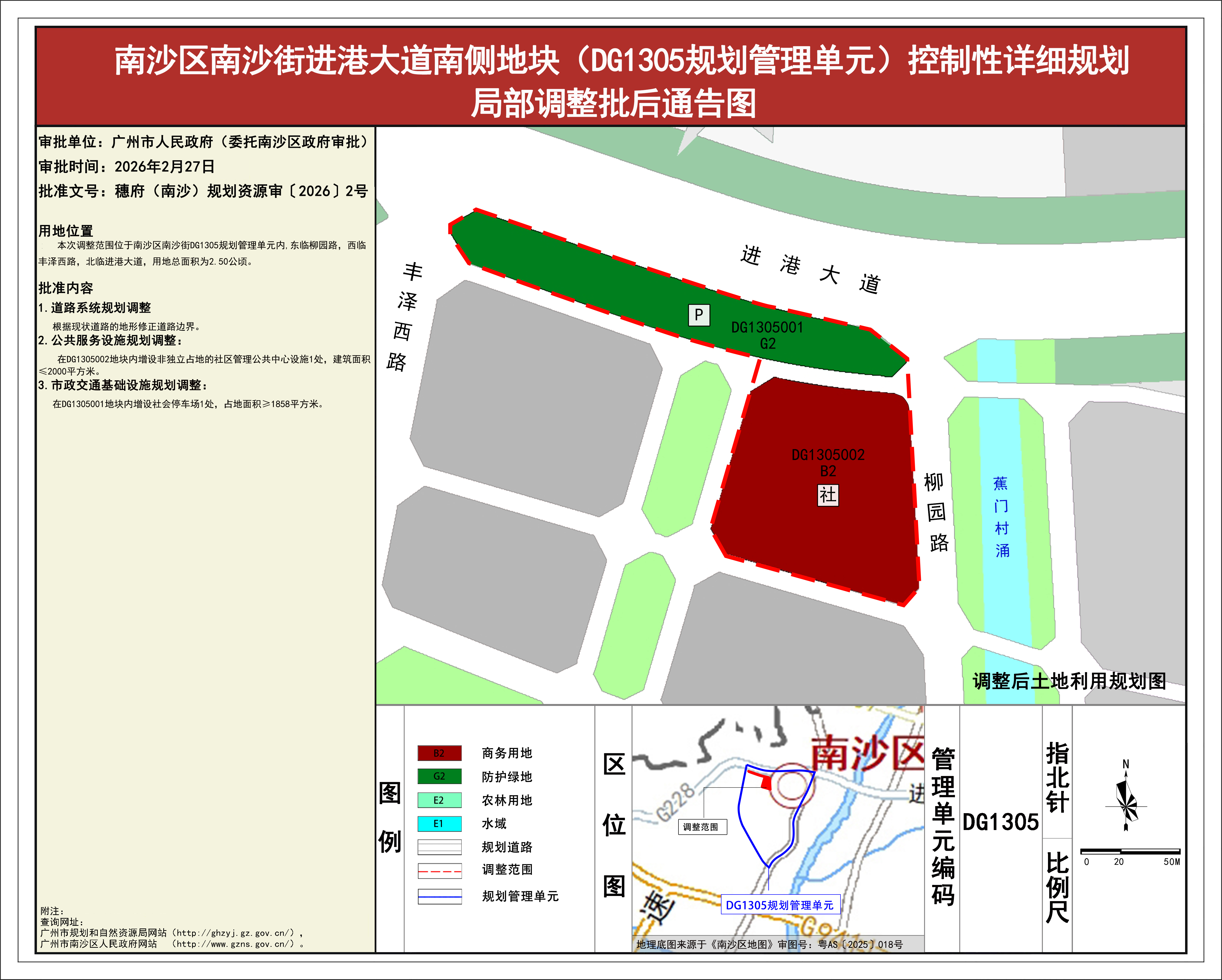 根据《广东省城市控制性详细规划管理条例》《广州市城乡规划程序规定》有关规定,《南沙区南沙街进港大道南侧地块(DG1305规划管理单元)控制性详细规划局部调整》已完成规划技术审查、批前公示等程序,并经广州市南沙新区自然资源规划与利用委员会审议通过后获广州市人民政府(委托南沙区政府)批准(穗府(南沙)规划资源审〔2026〕2号),自批准之日(2026年2月27日)起生效。