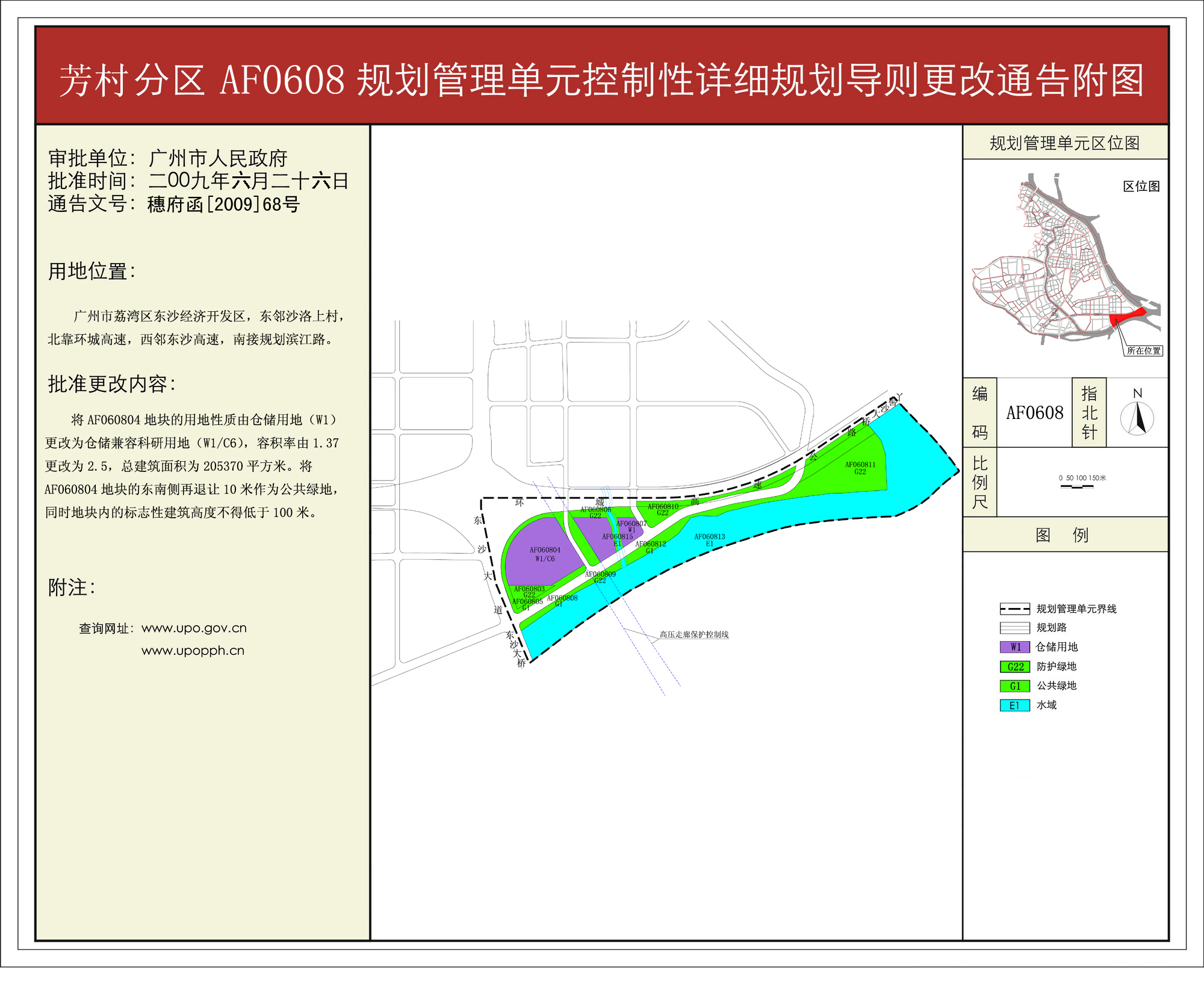 关于公布实施《芳村分区AF0608规划管理单元(广东塑料交易所仓储中心地块)控制性详细规划导则更改》等五项规划成果的通告