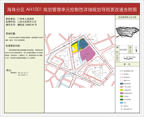 根据《广东省城市控制性详细规划管理条例》,黄埔分区AP0203、AP0206规划管理单元(广州本田黄埔工厂及周边地区)控制性详细规划导则更改、海珠分区AH1001规划管理单元(中国电信广州数据中心用地)控制性详细规划导则更改、芳村分区AF0502规划管理单元(海南村经济发展用地)控制性详细规划导则更改、芳村分区AF0215规划管理单元(东漖联社用地)控制性详细规划导则更改、天河分区AT0208规划管理单元(广东省韶钢集团广州信息研发总部项目)控制性详细规划导则更改、白云分区AB2112规划管理单元(广州市动物防疫监督所用地)控制性详细规划导则更改六项方案已完成广州市规划局审查、批前公示等程序,并经广州市城市规划委员会审议通过后获广州市人民政府批准。
