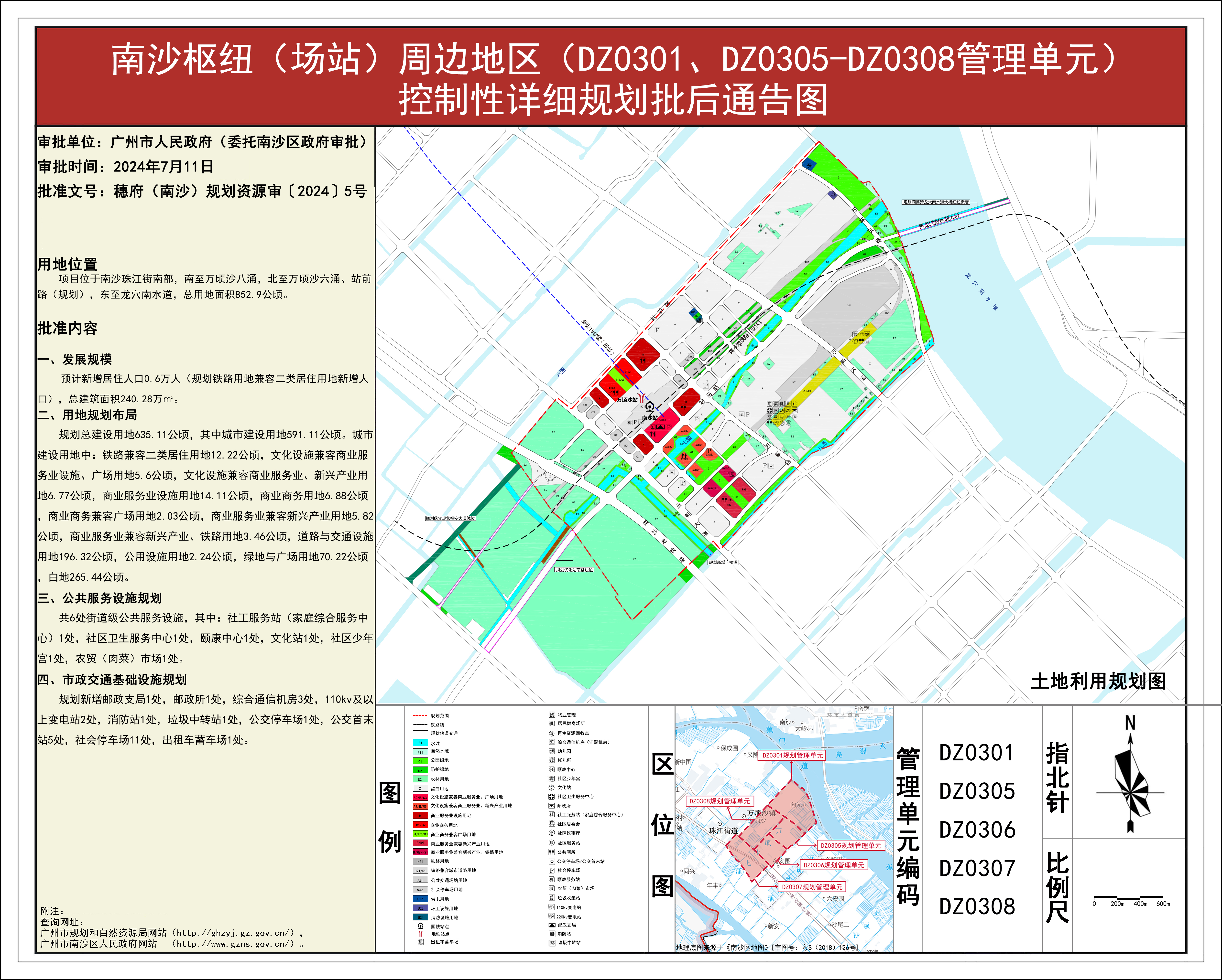 根据《广东省城市控制性详细规划管理条例》《广州市城乡规划程序规定》有关规定,《南沙枢纽(场站)周边地区(DZ0301、DZ0305-DZ0308管理单元)控制性详细规划》已完成规划技术审查、批前公示等程序,并经广州市南沙新区自然资源规划与利用委员会审议通过后获广州市南沙区人民政府(受广州市人民政府委托)批准(穗府(南沙)规划资源审〔2024〕5号),自批准之日(2024年7月11日)起生效。