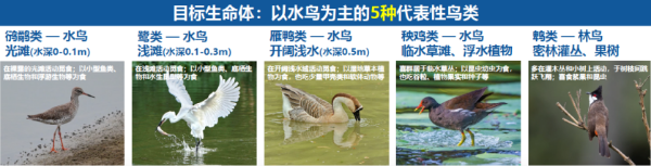 二是目标物种的精准服务。通过区域生物群落详尽调研,构建了能服务于约4万只迁徙鸟类的多维生境系统,设计了光滩、浅滩、水塘、草滩及密林灌丛等多样化生境。