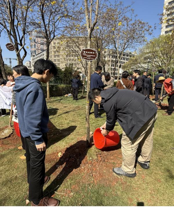 活动现场春意盎然、氛围热烈。党员干部精神饱满、干劲十足,大家分工协作、配合默契,挖坑、栽苗、浇水,一道道工序规范有序、一丝不苟。一株株黄花风铃木迎风挺立,为城市核心地标增添盎然生机与靓丽风景。党员们以实际行动践行生态保护责任,让 “党建红”引领“生态绿”,成为春日里一道动人风景线。此次植树活动,既是一次生动的生态文明实践,也是一次凝聚合力的党性教育。活动进一步厚植了城区绿色基底,激发了市民群众爱绿、植绿、护绿、兴绿的行动自觉,为提升城市生态品质、营造绿色宜居环境注入强劲动力。