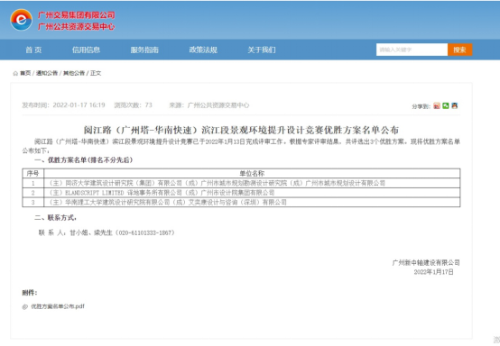 根据竞赛日程安排,参赛机构于2022年1月10日提交正式设计成果,主办单位于1月12-13日组织召开了阅江路(广州塔-华南快速)滨江段景观环境提升设计竞赛优胜方案评审会。经专家组评审,最终评选出3个优胜方案。3个优胜方案的参赛设计机构(联合体,排名不分先后)公布详见以下网站: