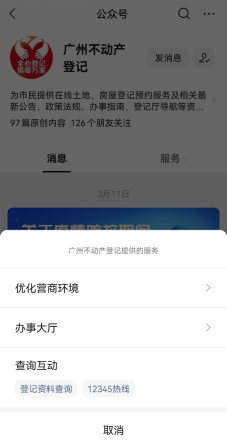 渠道三:“广州不动产登记”微信公众号可办理咨询、查询、预约等业务。