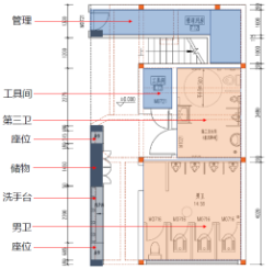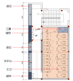 设计师团队打通内部闲置杂物房增加公厕厕位,同时优化公厕内部流线并增设了工具间及第三卫生间,大大提升了公厕的空间功能。不仅如此,还通过设置多功能厚墙的方式,匿藏清洁用房的工具存贮功能,做到在有限的场地内,最大化提升市民用厕体验。