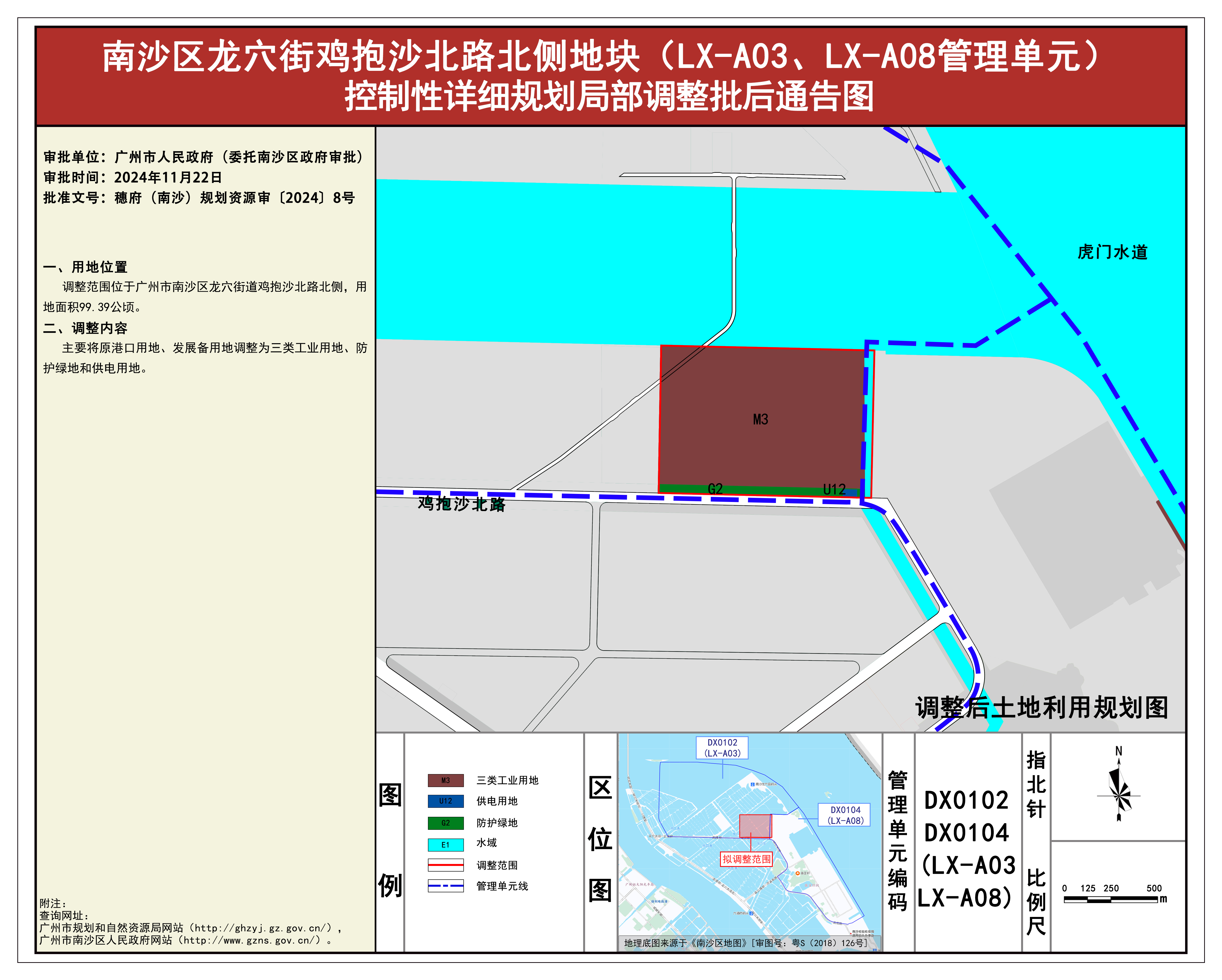 根据《广东省城市控制性详细规划管理条例》《广州市城乡规划程序规定》有关规定,《龙穴街鸡抱沙北路北侧地块(LX-A03、LX-A08管理单元)控制性详细规划局部调整》已完成规划技术审查、批前公示等程序,并经广州市南沙新区自然资源规划与利用委员会审议通过后获广州市南沙区人民政府(受广州市人民政府委托)批准(穗府(南沙)规划资源审〔2024〕8号),自批准之日(2024年11月22日)起生效。