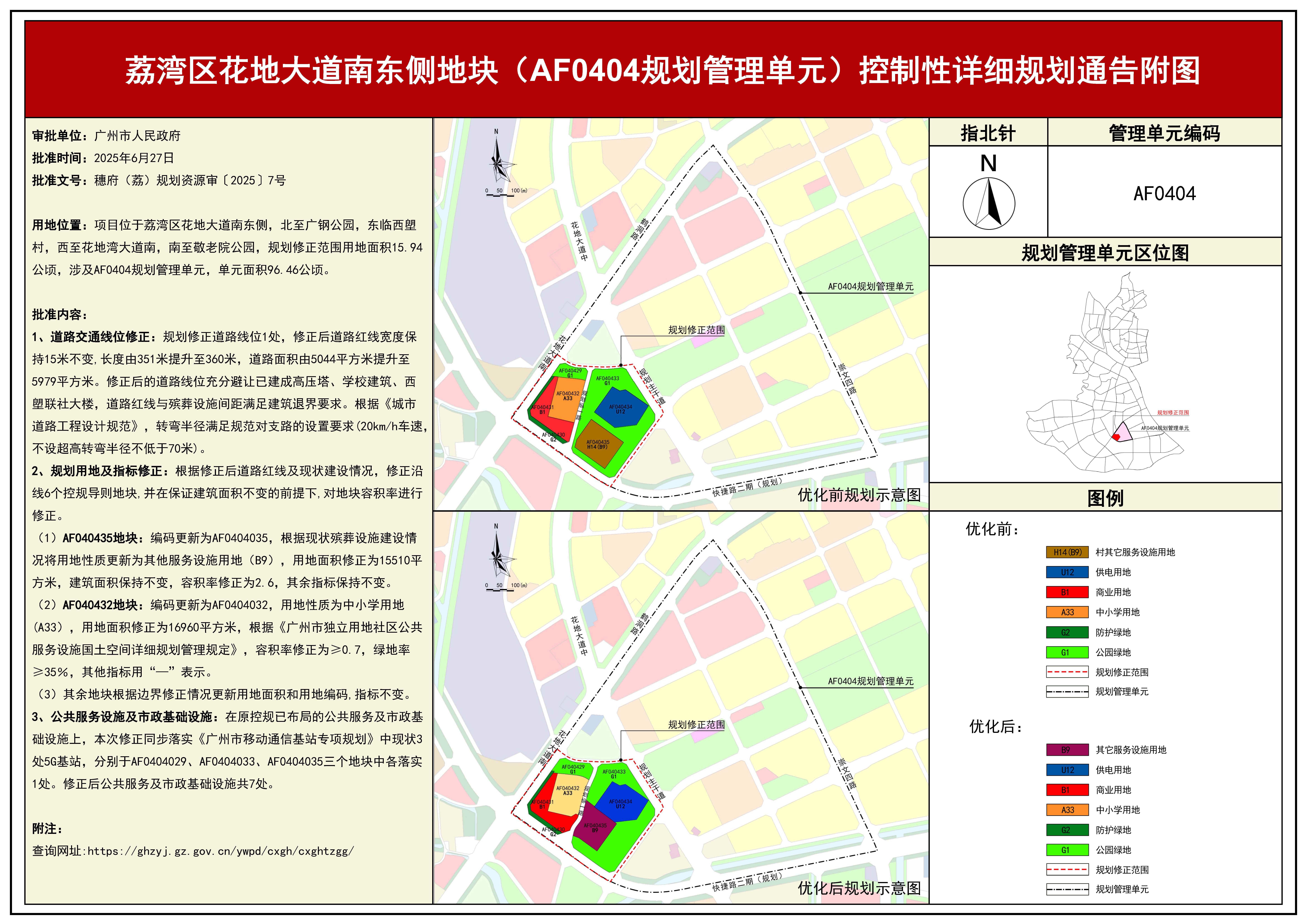 根据《中华人民共和国城乡规划法》、《广东省城市控制性详细规划管理条例》、《广州市城乡规划程序规定》等法律法规的要求,《荔湾区花地大道南东侧地块(AF0404规划管理单元)控制性详细规划修正》规划成果已完成编制、审查、公示等程序,由区长研究部署规划专题工作会议审议通过后经广州市人民政府批准(穗府(荔)规划资源审〔2025〕7号),自批准之日(2025年6月27日)起生效。
