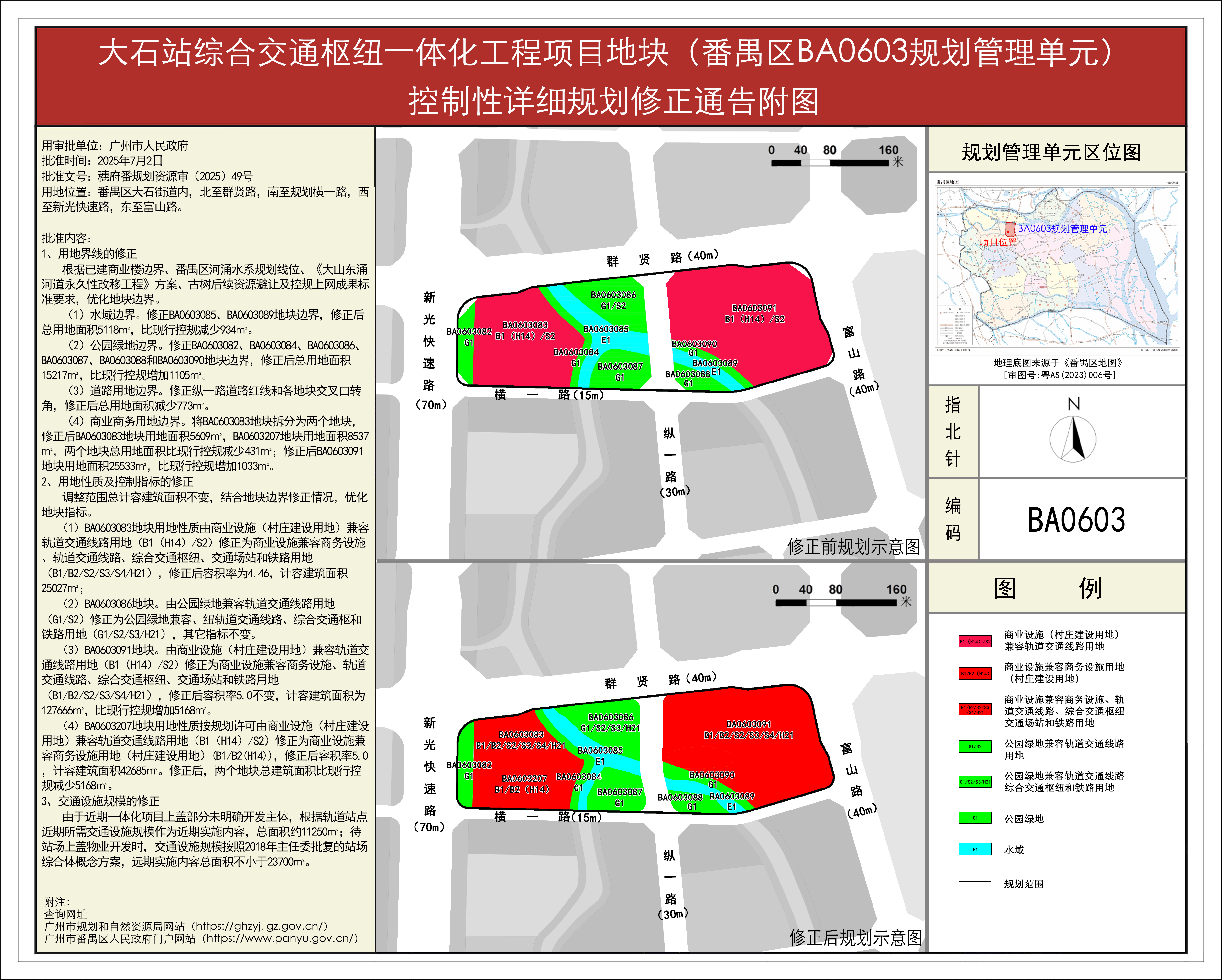 根据《广东省城市控制性详细规划管理条例》、《广州市人民政府关于将一批市级行政职权事项继续委托区实施的决定》(穗府〔2019〕8号)、《广州市人民政府关于收回一批市级行政权力事项的决定》(广州市人民政府令第188号),《大石站综合交通枢纽一体化工程项目地块(番禺区BA0603规划管理单元)控制性详细规划修正》规划成果已完成批前公示,并经番禺区政府常务会议(土地和规划专题)审议通过后,番禺区人民政府受广州市人民政府委托批准,自批准之日(2025年7月2日)起生效。