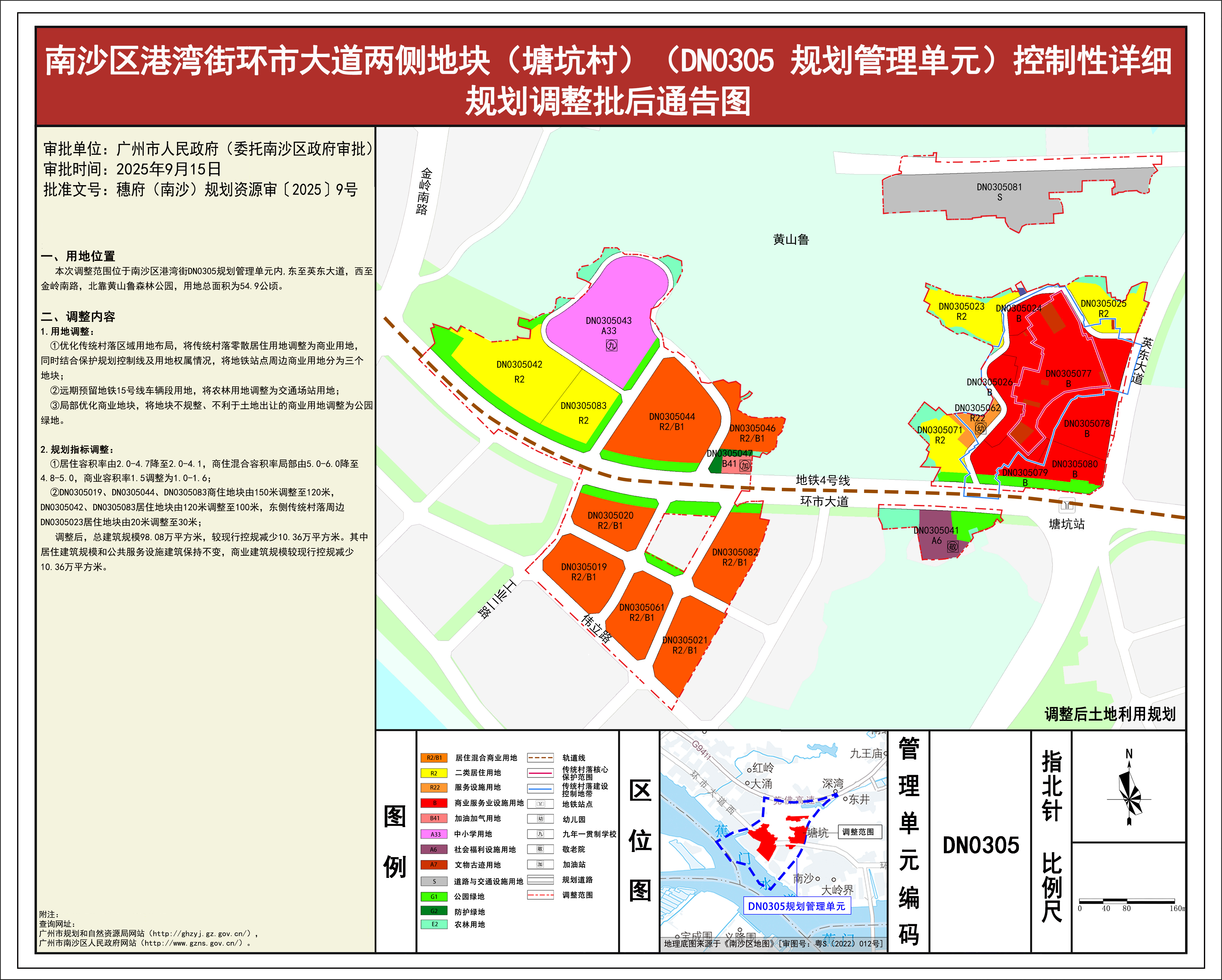 根据《广东省城市控制性详细规划管理条例》、广州市城乡规划程序有关规定,《南沙区港湾街环市大道两侧地块(塘坑村)(DN0305管理单元)控制性详细规划调整》已完成规划技术审查、批前公示等程序,并经广州市南沙新区自然资源规划与利用委员会审议通过后获广州市南沙区人民政府(受广州市人民政府委托)批准(穗府(南沙)规划资源审〔2025〕9号),自批准之日(2025年9月15日)起生效。