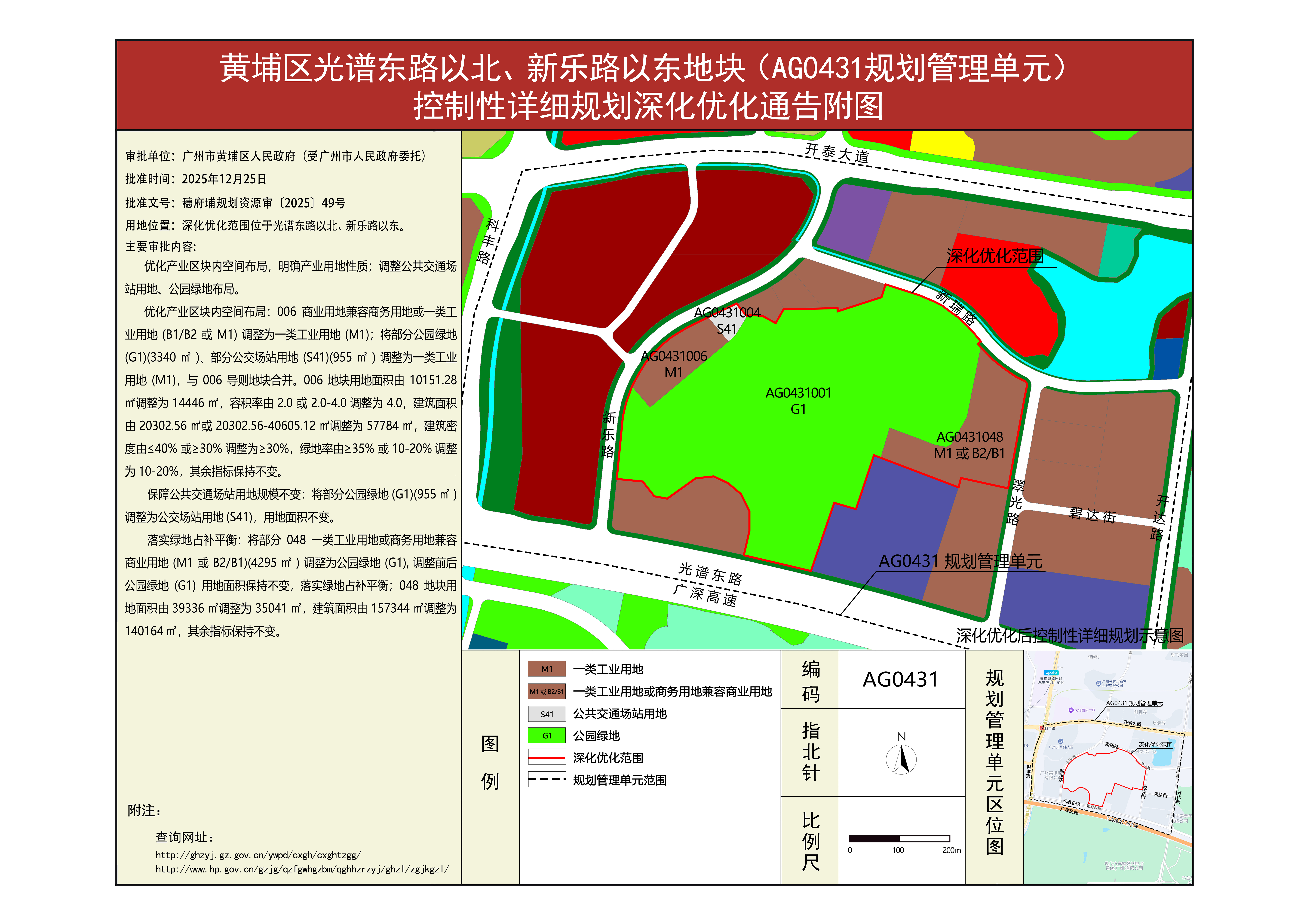 根据《广东省城市控制性详细规划管理条例》要求,《黄埔区光谱东路以北、新乐路以东地块(AG0431规管理单元)控制性详细规划深化优化》已完成规划技术审查、批前公示等程序,并经广州市人民政府批准(穗府埔规划资源审〔2025〕49号),自批准之日(2025年12月25日)起生效。