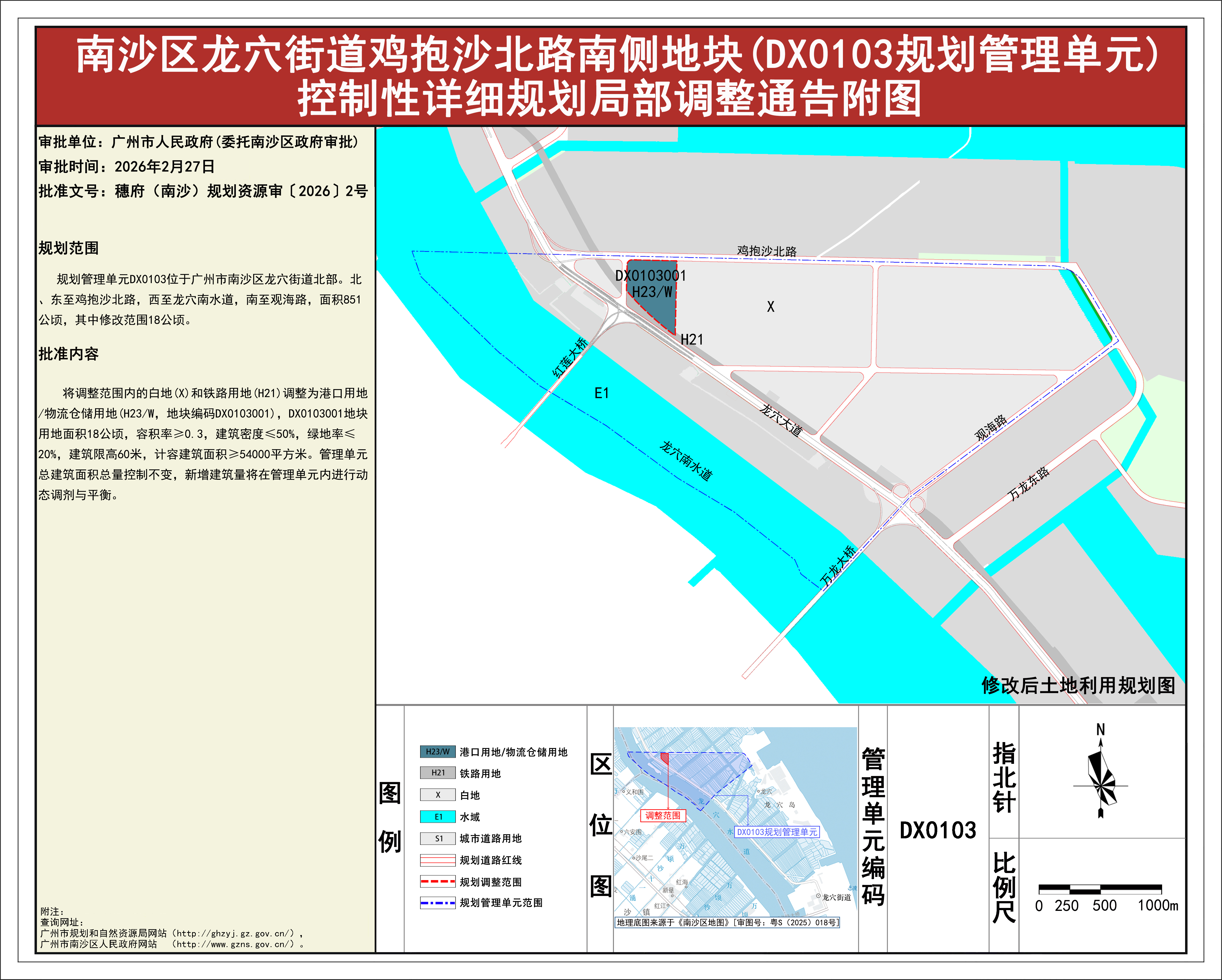 根据《广东省城市控制性详细规划管理条例》《广州市城乡规划程序规定》有关规定,《南沙区龙穴街道鸡抱沙北路南侧地块(DX0103规划管理单元)控制性详细规划局部调整》已完成规划技术审查、批前公示等程序,并经广州市南沙新区自然资源规划与利用委员会审议通过后获广州市南沙区人民政府(受广州市人民政府委托)批准(穗府(南沙)规划资源审〔2026〕2号),自批准之日(2026年2月27日)起生效。