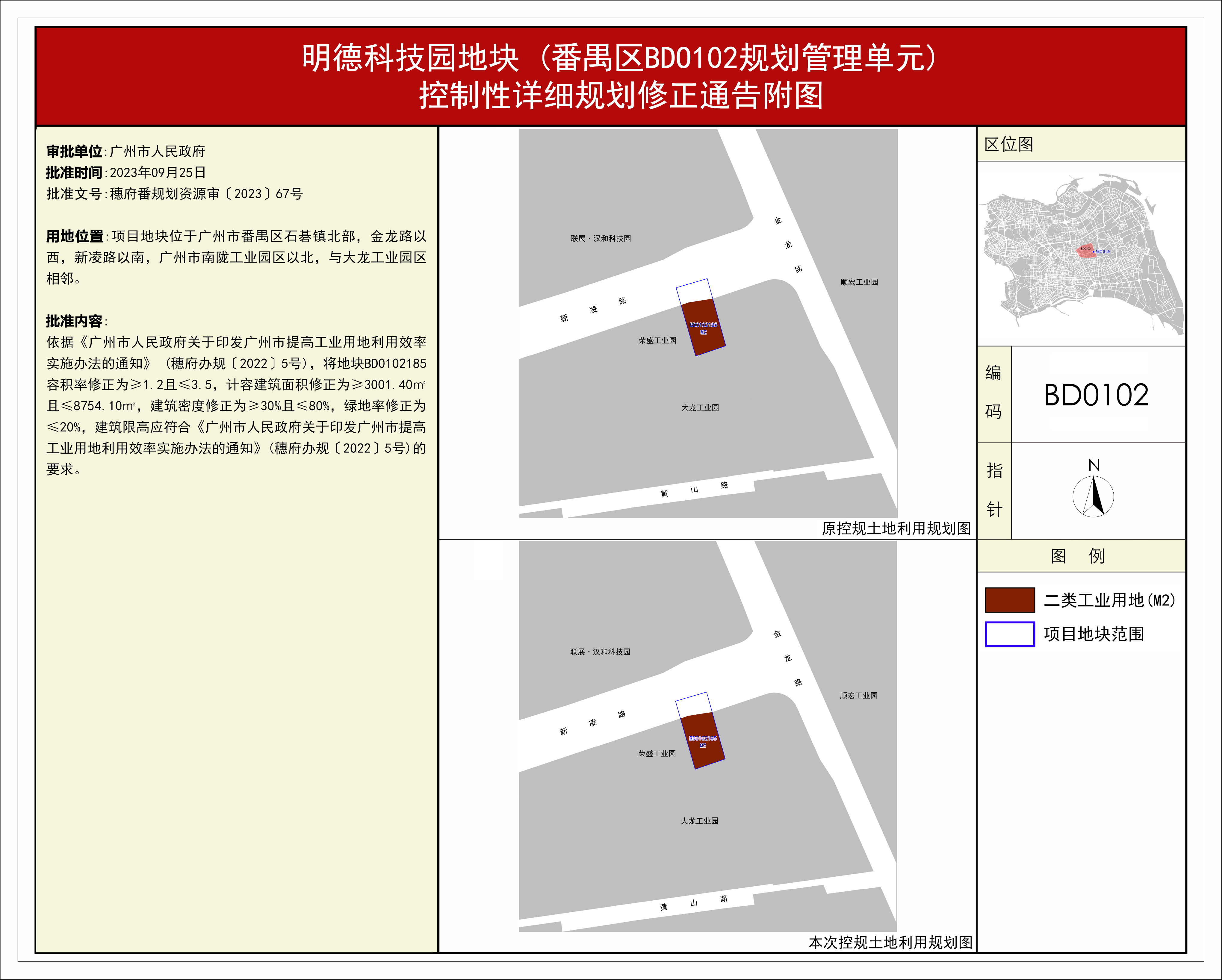 根据《广东省城市控制性详细规划管理条例》、《广州市人民政府关于将一批市级行政职权事项继续委托区实施的决定》(穗府[2019]8号)、《广州市人民政府关于收回一批市级行政权力事项的决定》(广州市人民政府令第188号),《明德科技园地块(番禺区BD0102规划管理单元)控制性详细规划修正》规划成果已完成规划技术审查、批前公示等程序,并经番禺区土地和规划领导小组会议审议通过后获广州市人民政府批准,自批准之日(2023年9月25日)起生效。