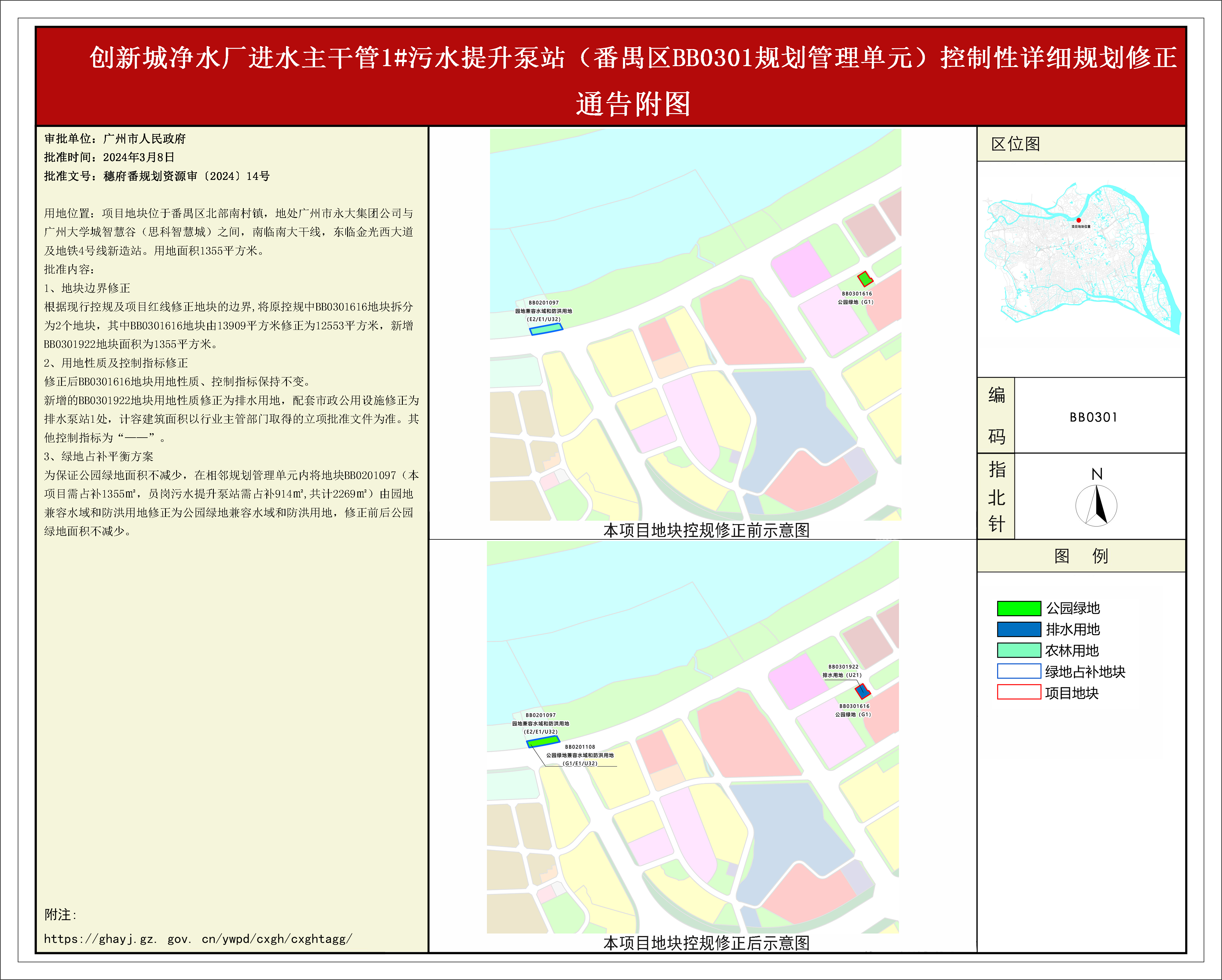 根据《广东省城市控制性详细规划管理条例》、《广州市人民政府关于将一批市级行政职权事项继续委托区实施的决定》(穗府[2019]8号),《创新城净水厂进水主干管1#污水提升泵站(番禺区BB0301规划管理单元)控制性详细规划修正》规划成果已完成规划技术审查、批前公示等程序,并经番禺区土地和规划领导小组会议审议通过后获广州市人民政府批准,自批准之日(2024年3月8日)起生效。