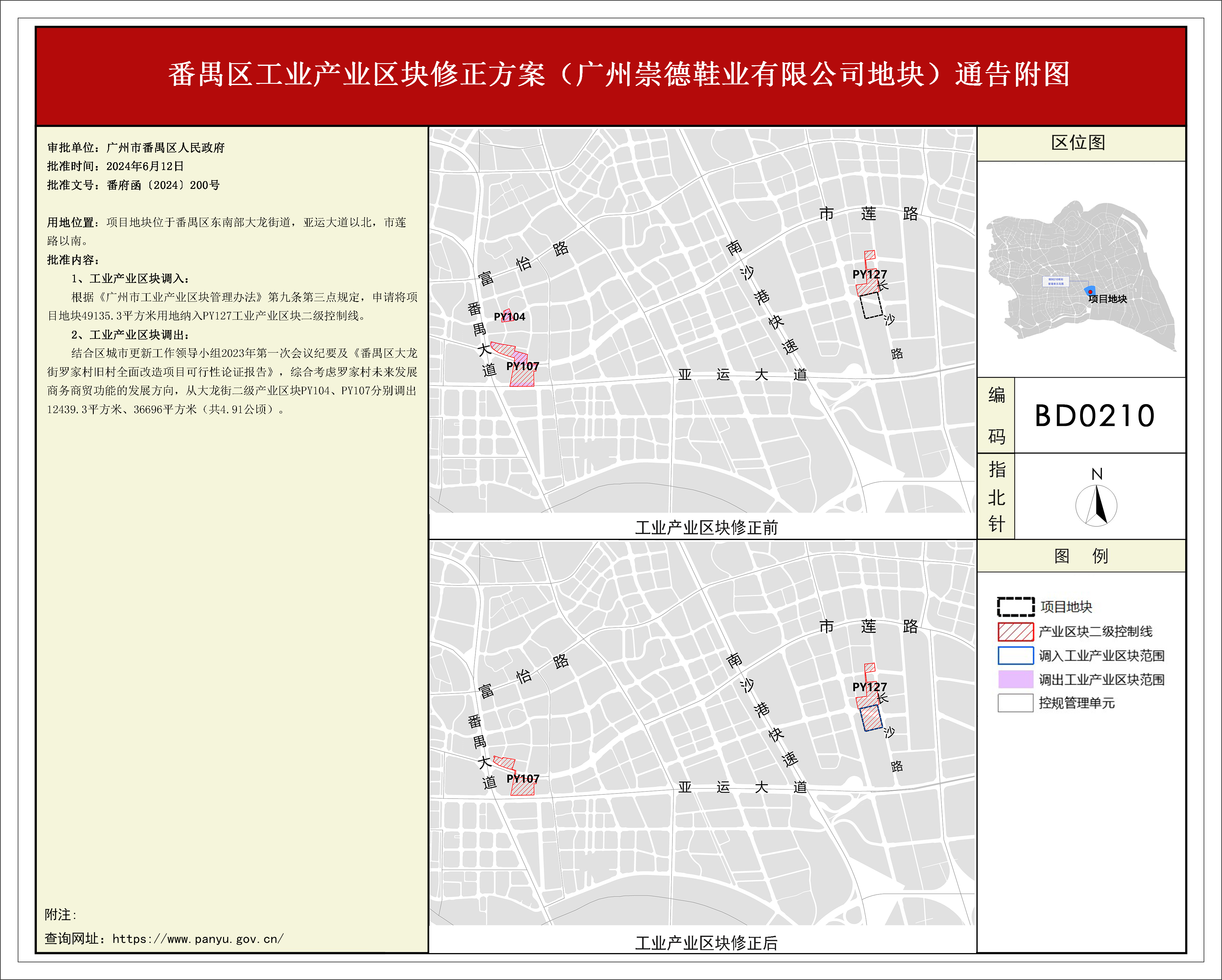 为优化我区产业空间布局,根据《广州市工业产业区块管理办法》(下称《管理办法》),我区组织编制了《番禺区工业产业区块修正方案(广州崇德鞋业有限公司地块)》。该修正方案于2024年6月12日获番禺区人民政府批准(番府函﹝2024﹞200号),自批准之日起生效。