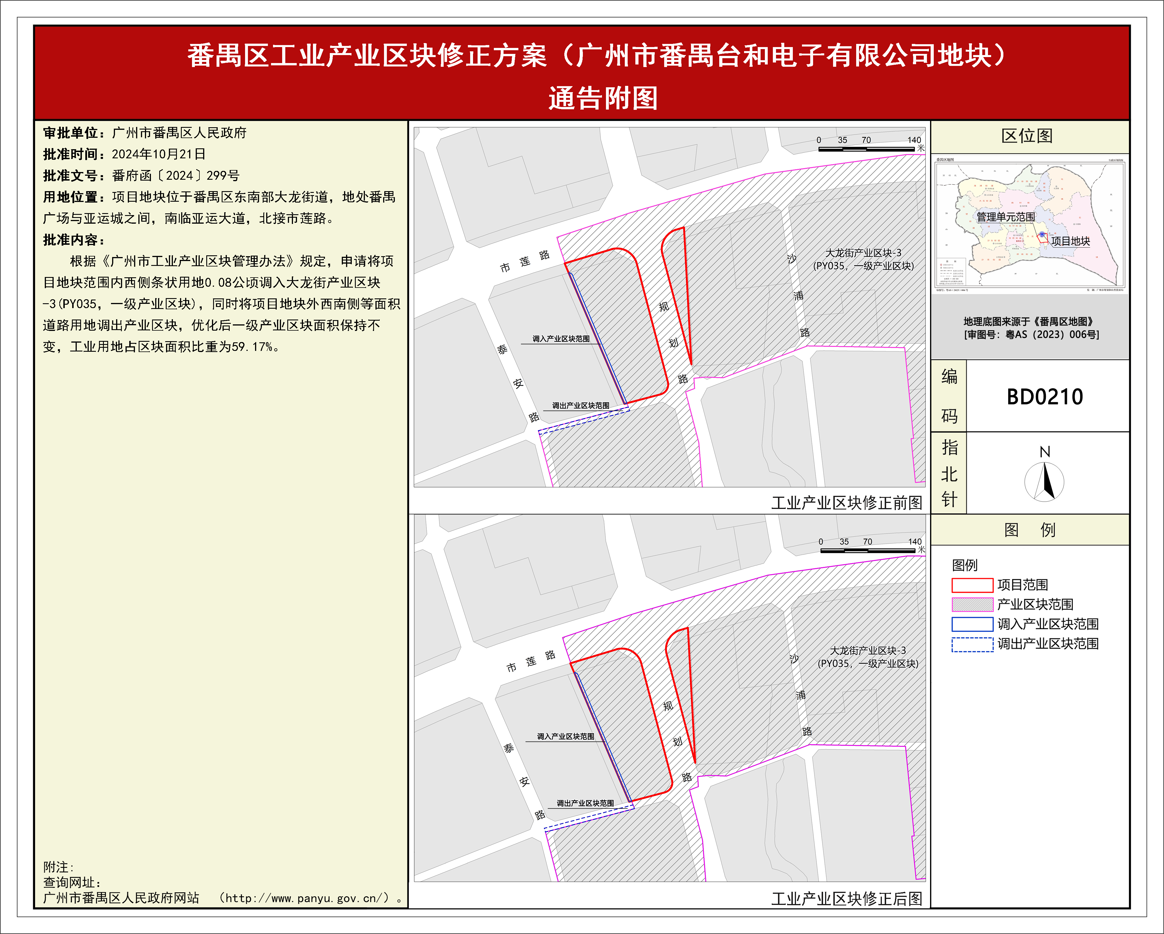 为优化我区产业空间布局,根据《广州市工业产业区块管理办法》(下称《管理办法》),我区组织编制了《番禺区工业产业区块修正方案(广州市番禺台和电子有限公司地块)》。该修正方案于2024年10月21日通过番禺区人民政府批准同意(自批准之日起生效)。