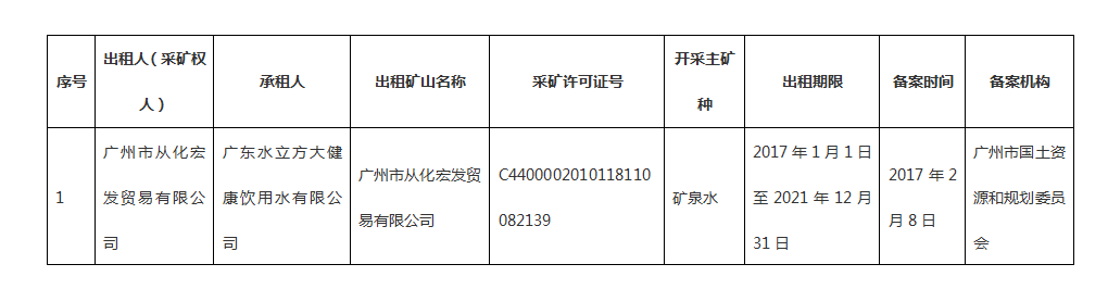 根据广东省国土资源厅《关于取消采矿权出租审批和采矿权抵押备案的通知》(粤国土资矿管发〔2012〕164号)有关规定,现将我委2017年2月采矿权出租备案信息公告如下: