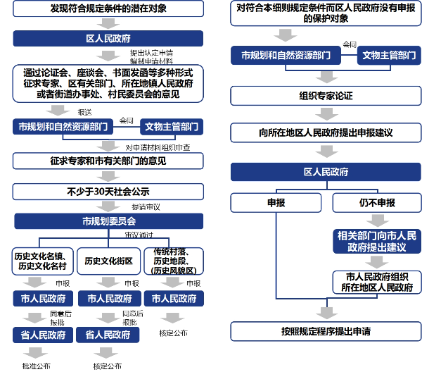 针对历史文化名镇名村、历史文化街区、传统村落、历史地段(历史风貌区),明确区级申报应征求专家、镇人民政府、街道办事处、村民委员会等区有关部门的意见。市级审查应征求专家和市有关部门意见。