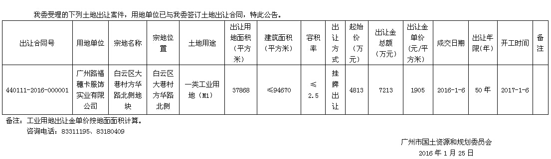广州市国有建设用地使用权出让公告(白云区大巷村方华路北侧地块)