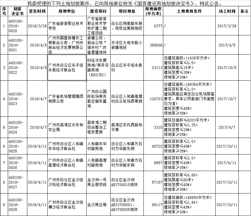 2016年4月广州市国有土地使用权划拨情况公告 沙巴体育APP网站