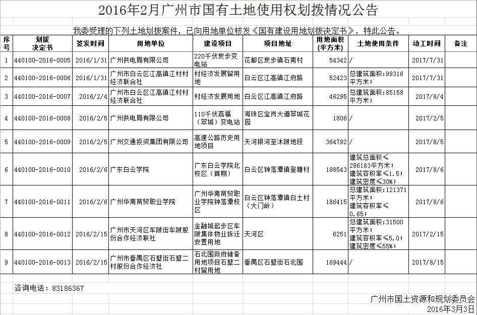 2016年2月广州市国有土地使用权划拨情况公告 沙巴体育APP网站