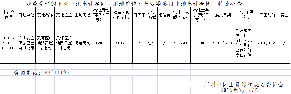 广州市国有建设用地使用权出让公告(2016年7月21日出让地块)