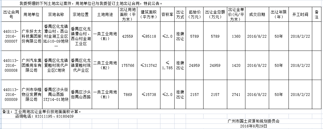 广州市国有建设用地使用权出让公告(番禺区2016年8月22日成交地块)