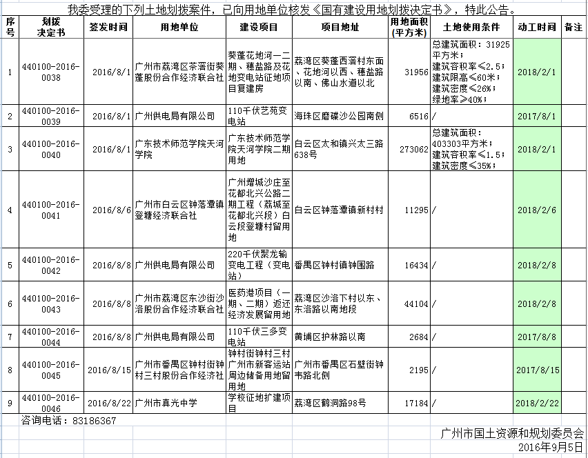 2016年8月广州市国有土地使用权划拨情况公告 沙巴体育平台网站