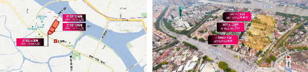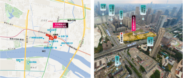地块位于天河区南部、广州国际金融城东区,南侧临近珠江,北侧靠近黄埔大道。驾车10分钟可到达琶洲CBD、驾车15分钟到达珠江新城,快速连接广州两大核心商务区。
