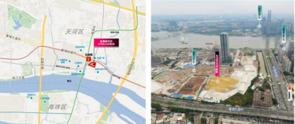 地块位于天河区南部、广州国际金融城起步区,南侧临近珠江,北侧靠近黄埔大道。地块位于地铁4号线、5号线的换乘站、30号线(规划)沿线,轨道交通优势显著。