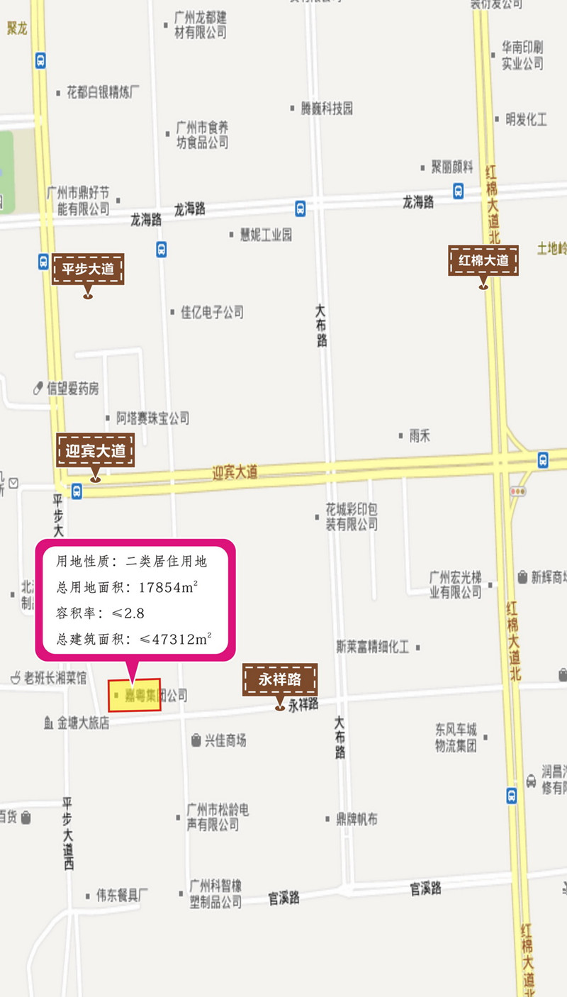 地块位于花都中心城区新华街,区域配套居住用地。地处平布大道西与永祥路交界,与迎宾大道、红棉大道往来便捷;毗邻规划地铁九号线飞鹅岭始发站。