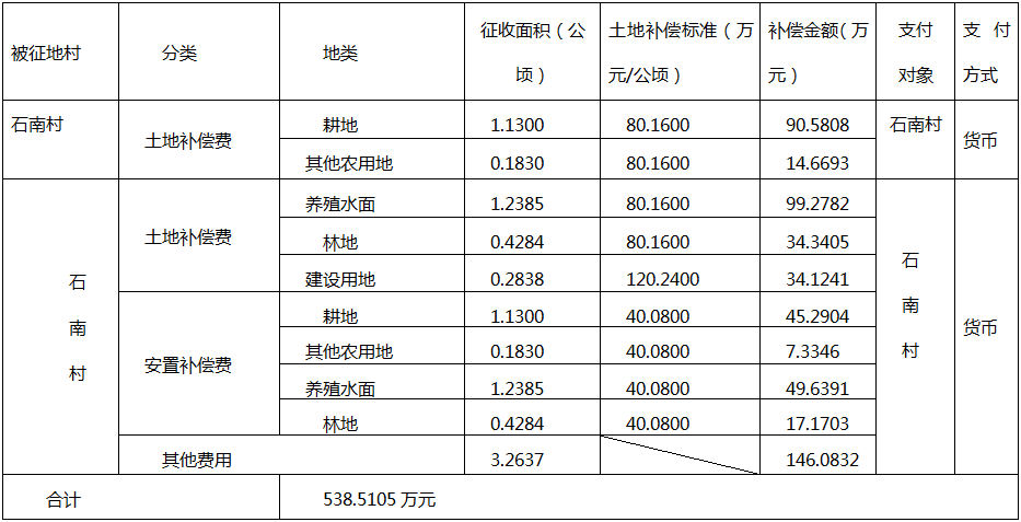 花都区炭步镇石南村集体土地合计3.2637公顷(合48.9555亩),其中农用地2.9799公顷(耕地1.1300公顷、林地0.4284公顷、养殖水面1.2385、其他农用地0.1830公顷),建设用地0.2838公顷;