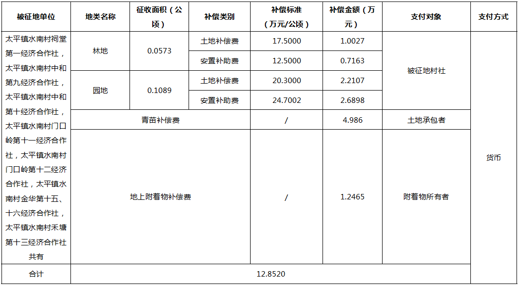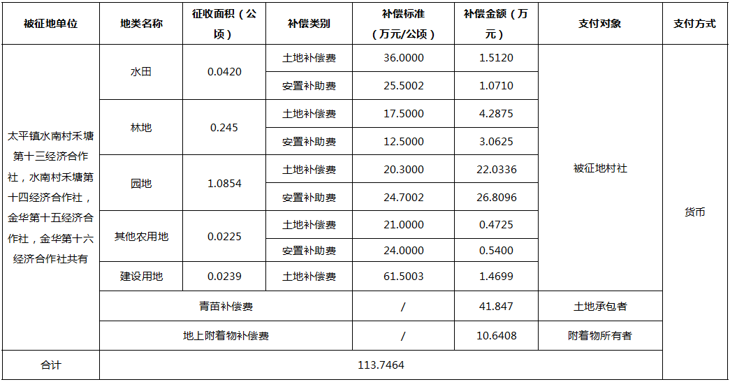 (二)本次征收土地所涉及的被安置农业人员由广州市从化区太平镇水南村禾塘第十三、第十四经济合作社,金华第十五、第十六经济合作社,祠堂第一经济合作社,中和第九、第十经济合作社,门口岭第十一、第十二经济合作社以货币补偿等形式安置。
