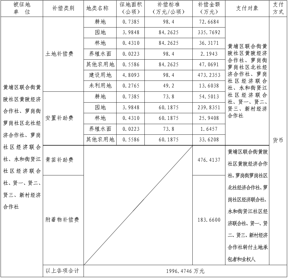 广州市黄埔区联合街黄陂社区黄陂经济合作社、萝岗街萝岗社区北社经济合作社、萝岗社区经济联合社、永和街贤江社区经济联合社、贤一、贤二、贤三、新村经济合作社属下集体土地10.8210公顷(合162.315亩),其中耕地0.7385公顷(合11.0775亩),园地3.9848公顷(合59.772亩),林地0.4310公顷(合6.465亩),养殖水面0.0223公顷(合0.3345亩),其他农用地0.5586公顷(合8.3790亩),建设用地4.8093公顷(合72.1395亩),未利用地0.2765公顷(合4.1475亩)。