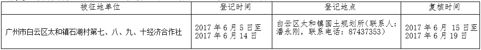 经广州市人民政府同意并经沙巴体育平台批准(粤国土资(建)字〔2017〕239号)同意将白云区太和镇石湖村地段5.5541公顷集体土地征收为国有土地。现将经依法批准的《征收土地方案》、市人民政府批准的《征地补偿安置方案》内容和有关事项公告如下: