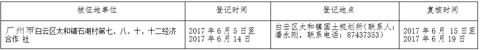 经广州市人民政府同意并经沙巴体育平台批准(粤国土资(建)字〔2017〕239号)同意将白云区广从路105国道太和镇石湖村段东侧地段31.9672公顷集体土地征收为国有土地。现将经依法批准的《征收土地方案》、市人民政府批准的《征地补偿安置方案》内容和有关事项公告如下:
