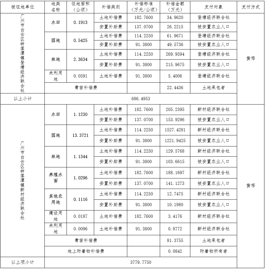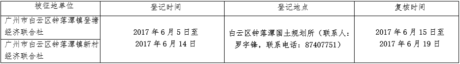 (二)本次征收土地所涉及的被安置农业人员由广州市白云区钟落潭镇登塘农民集体经济联合社、新村农民集体经济联合社以货币补偿的形式安置。请被征地村在本公告期内到广州市白云区国土资源和规划局领取办理安置农业人口征地农转非手续的函件。