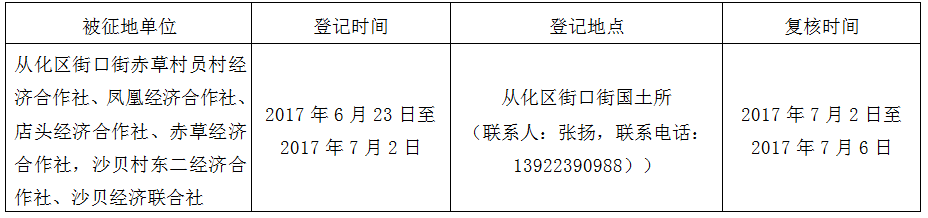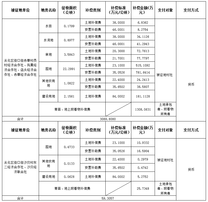 (二)本次征收土地所涉及的被安置农业人员由广州市从化区街口街赤草村员村经济合作社、凤凰经济合作社、店头经济合作社、赤草经济合作社,沙贝村东二经济合作社、沙贝经济联合社以货币补偿等形式安置。