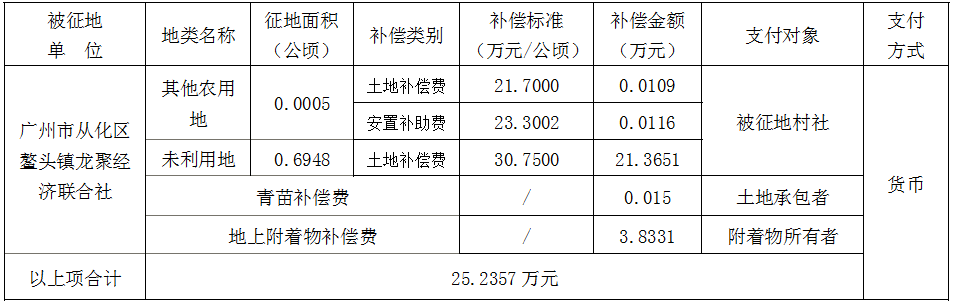 (二)本次征收土地所涉及的被安置农业人员由广州市从化区鳌头镇龙聚经济联合社以货币补偿等形式安置。